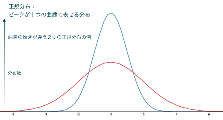 正規分布とは平均・中心からの分布(ばらつき方)を表したものです。ばらつき具合は正規分布のグラフの形に収束するだろうという確率論や統計論の説明に使う分布です。